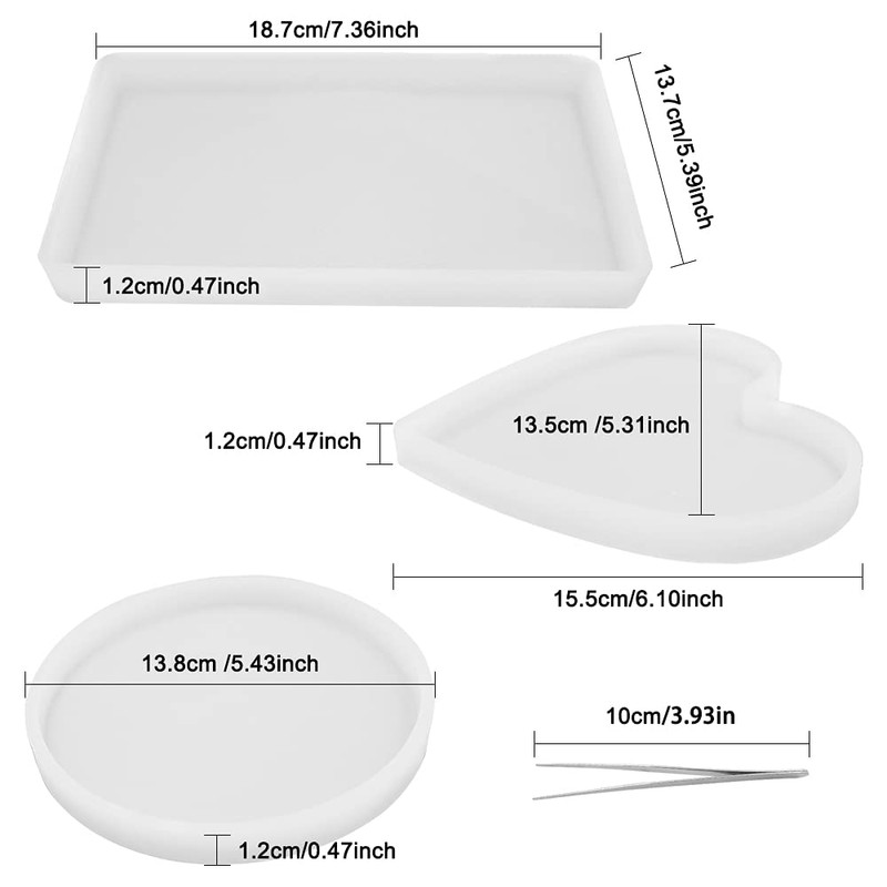 - Tamaño: molde de resina rectangular: 18,7 x 13,7 x 1,2 cm. Moldes de corazón: 15,5 x 13,5 x 1,2 cm. Moldes redondos: 13,8 x 13,8 x 1,2 cm.