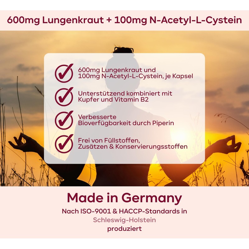 - High dose: 600 mg pure lungwort per capsule – also known as Lungwort or Lungwort capsules – rounded off with the matching trace elements copper and manganese