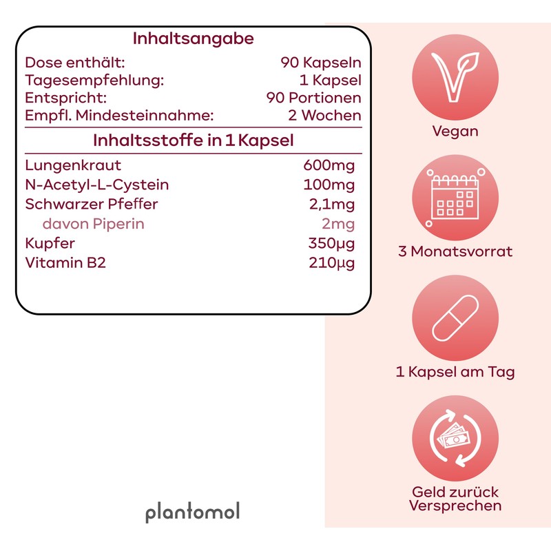 - Money back: If you are not completely satisfied, we guarantee an uncomplicated refund. Try plantomols 90 lungwort capsules now risk-free - vegan and high dosage