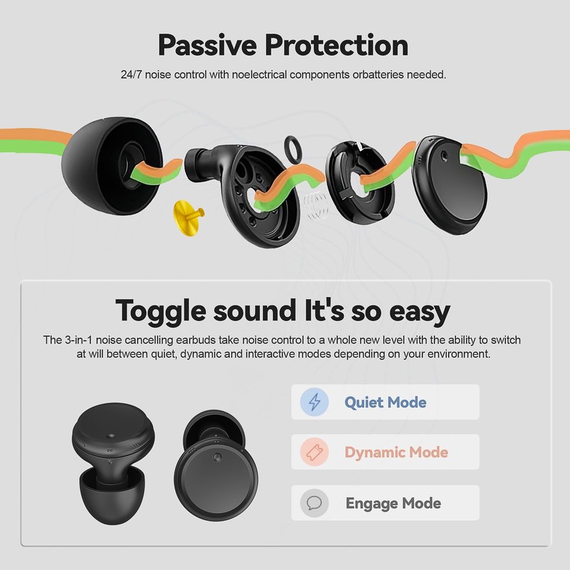 • Adjustable Ear Plugs - Three levels of noise reduction in one convenient earplug,Discover complete control in any setting,Use the in-ear dial to easily switch between Quiet Mode/Dynamic Mode/Engage Mode, in the moment relief