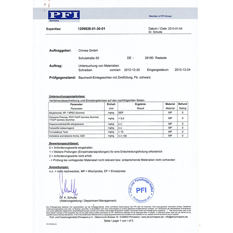 The cinnamon soles from Cinnea are tested for allergies in Germany by PFI Germany (testing and research institute Pirmasens e.V.).