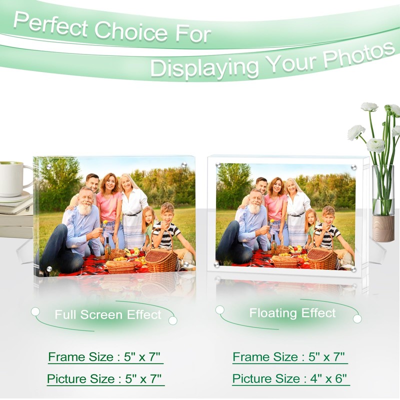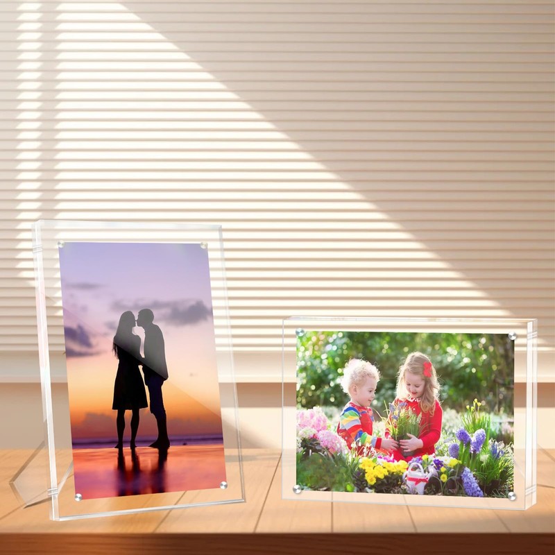 • Acrylic Frames Easy to Use: Our acrylic frames with a solid stand can free standing more stable and also incredibly easy to use. Frameless picture frame simply slide the blocks apart to insert your pictures, and easily replace them with new photos no tools needed.