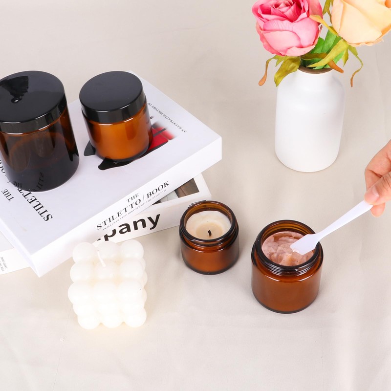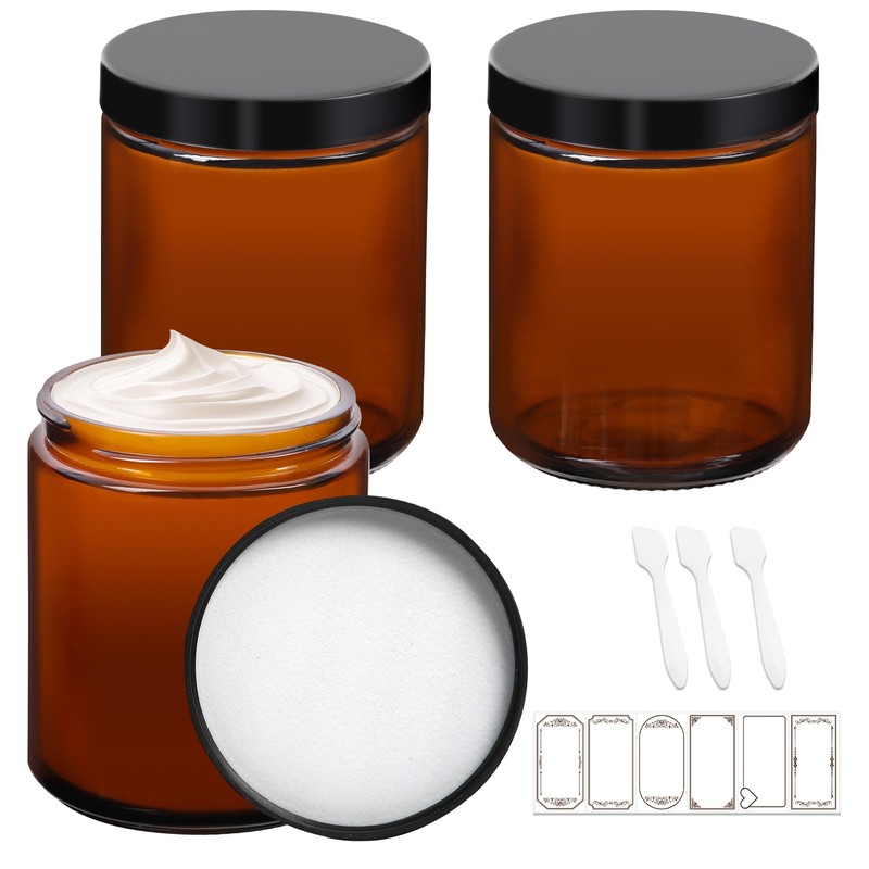 • PACKAGE INCLUDE:Include 3 pack 8 oz Amber glass jars with dome lids, 3 cosmetic spatulas and 6 Lables.