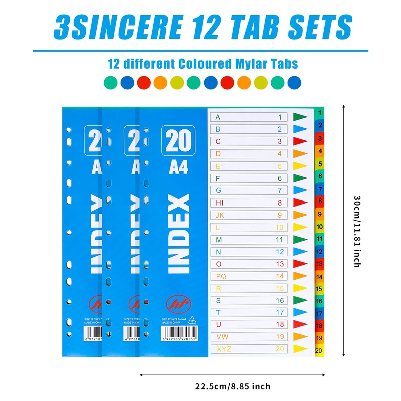 The colourful tabs have a size of 22.5 x 29.7 cm and are equipped with 11 holes, suitable for most A4 thumb cinemas. Each A4 index page divider set contains 20 loose leaf binder dividers in different colors, bright colors can easily attract your eyes to find what you are looking for