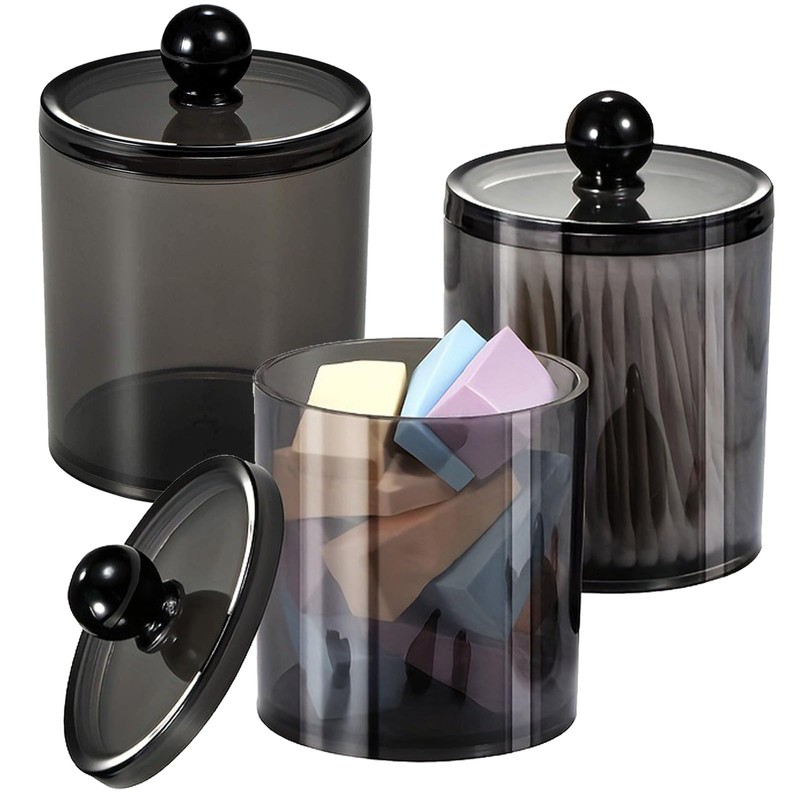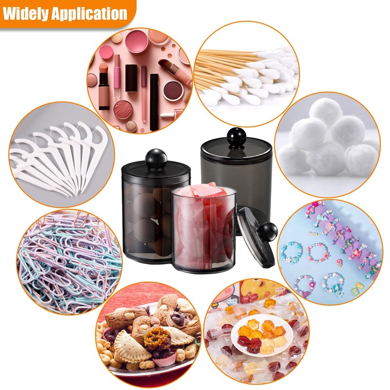 - 【Wide range of uses】: The black acrylic jar is used to store cotton swabs, cotton balls, makeup pads, makeup remover pads, cosmetics, earrings, skin care products, cotton swabs, elastic bands or other accessories. Perfect for kitchen, bedroom, bathroom, pantry, dresser, nightstand and more.
