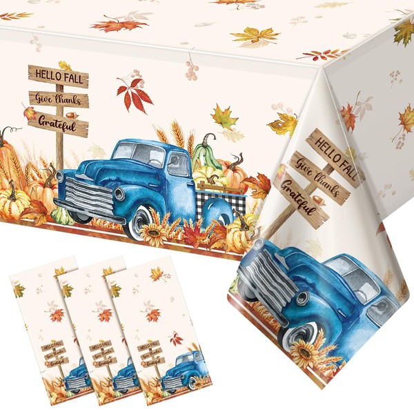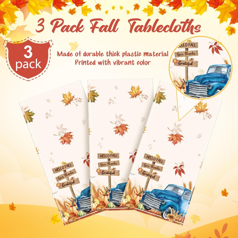 3 Pack Fall Tablecloth for Rectangle Tables, Disposable Fall Pumpkin Thanksgiving Table Cover, Maple Leaf Truck Fall Farmhouse Plastic Table Cloth for Autumn Thanksgiving Harvest Party Decorations