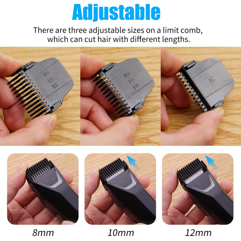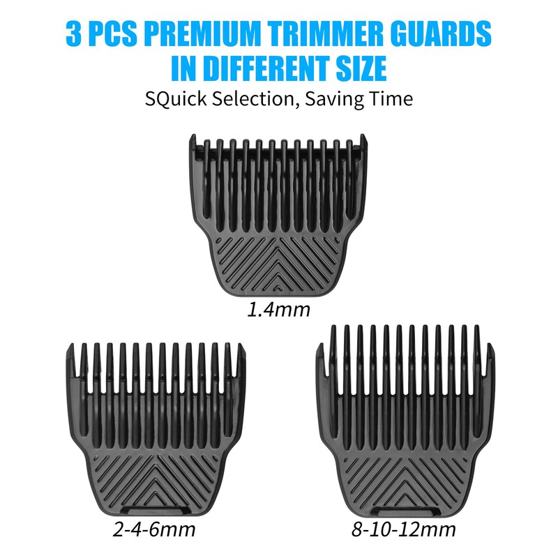 - ▶【GUARDS SIZES】: 3 replacement guards allows you to easily trim length of body hair, 7 different cutting lengths: (1.4mm-2mm-4mm-6mm-8mm-10mm-12mm). Clear size mark is on the back of the guards for you to choose the appropriate trimming length easily.