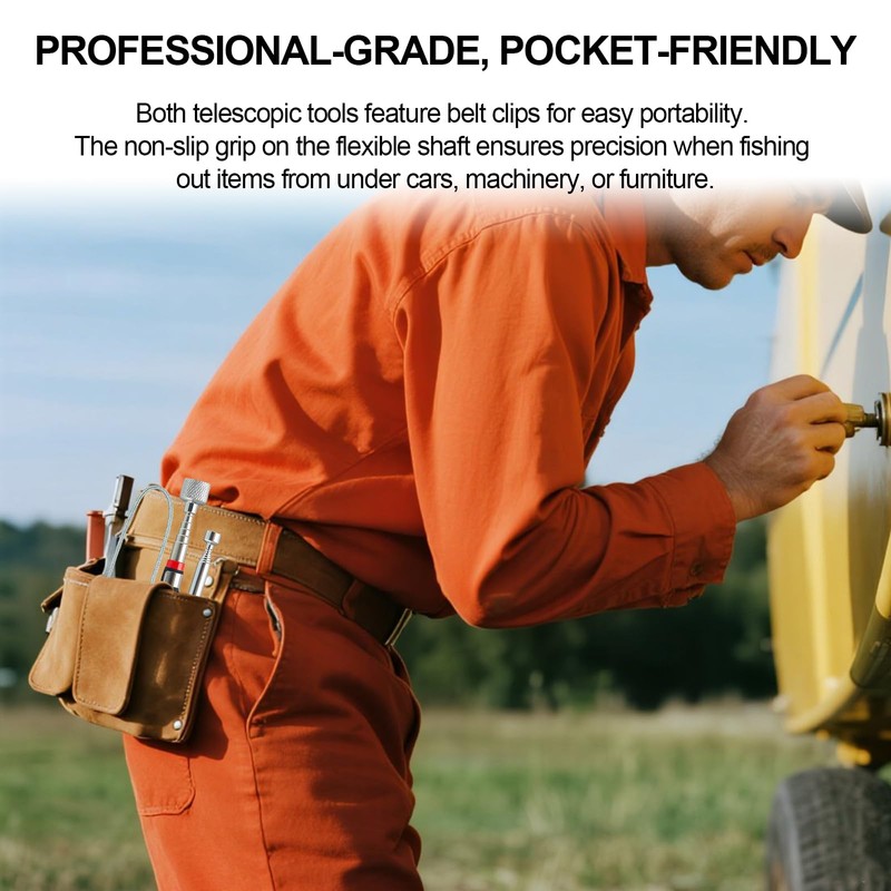 - PROFESSIONAL-GRADE, POCKET-FRIENDLY:Both telescopic tools feature belt clips for easy portability. The non-slip grip on the flexible shaft ensures precision when fishing out items from under cars, machinery, or furniture.