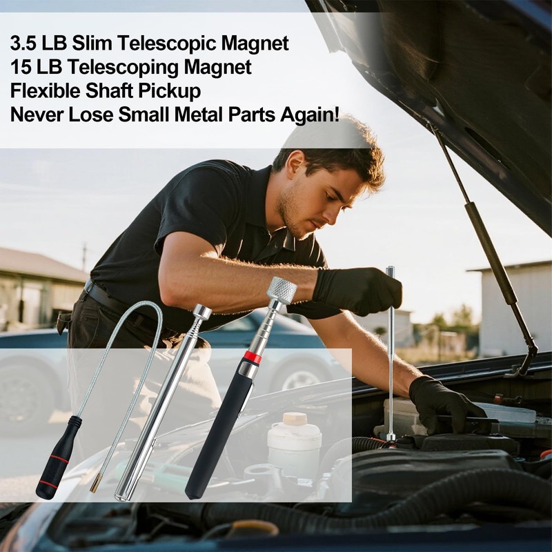 - STRONG & VERSATILE MAGNETS:The 15LB telescoping magnet effortlessly lifts hammers, wrenches, or screws; the 3.5LB slim model retrieves nuts/bolts from deep engine bays, while the flexible tool bends to reach keys, pins, or staples in crevices.