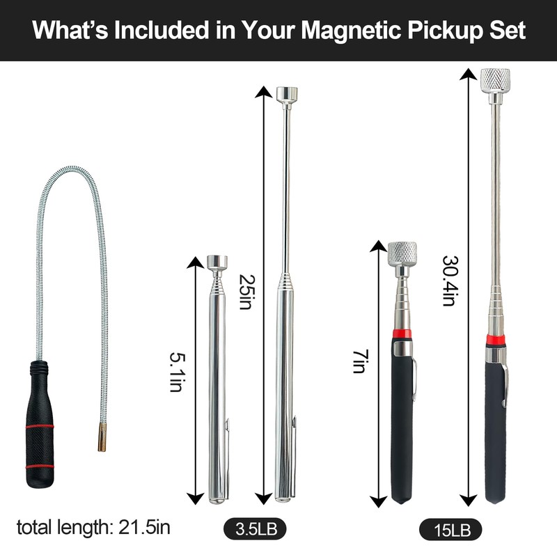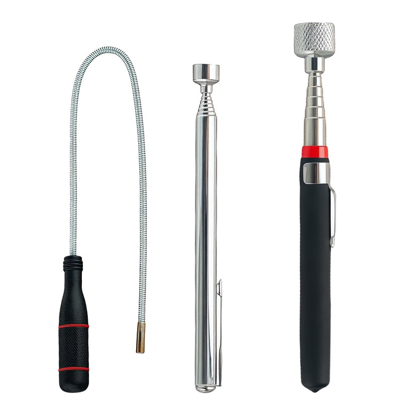 - 3-IN-1 MAGNETIC PICKUP SET:Includes (1) 15LB Telescoping retriever with strong pickup capacity, (2) 3.5LB slender telescopic magnet for tight spaces, and (3) flexible shaft pickup with ergonomic grip (1.5LB capacity). Never lose small metal parts again!