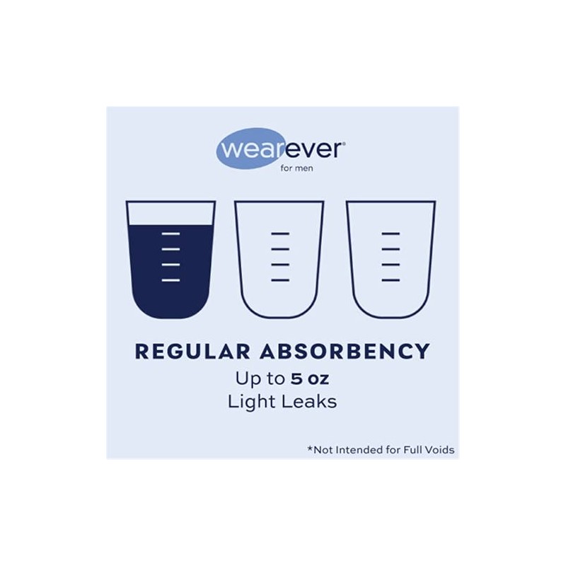 - Regular absorbency - Holds up to 5 ounces of liquid. Suitable for light to moderate incontinence. Not for heavy, severe, or total incontinence.
