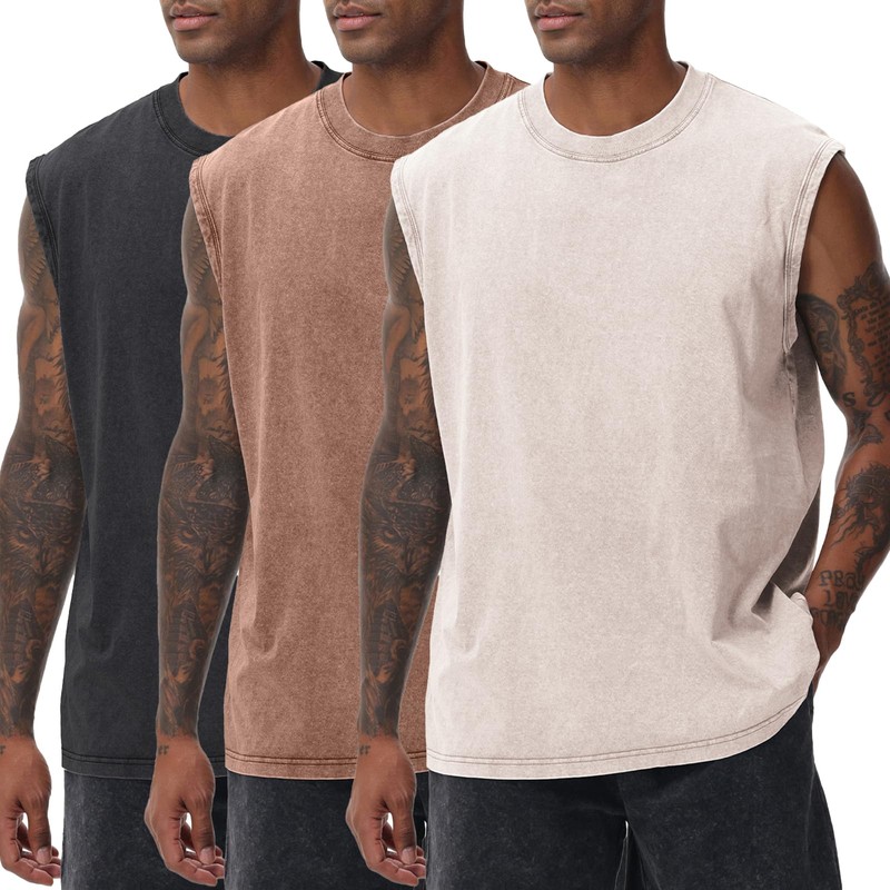 3 Pack Mens Workout Tank Tops Sleeveless Tee Shirts Men Muscle Shirt Gym Acid Wash T Shirts Running Beach Loose Fit Tee(ACCFBK,L)