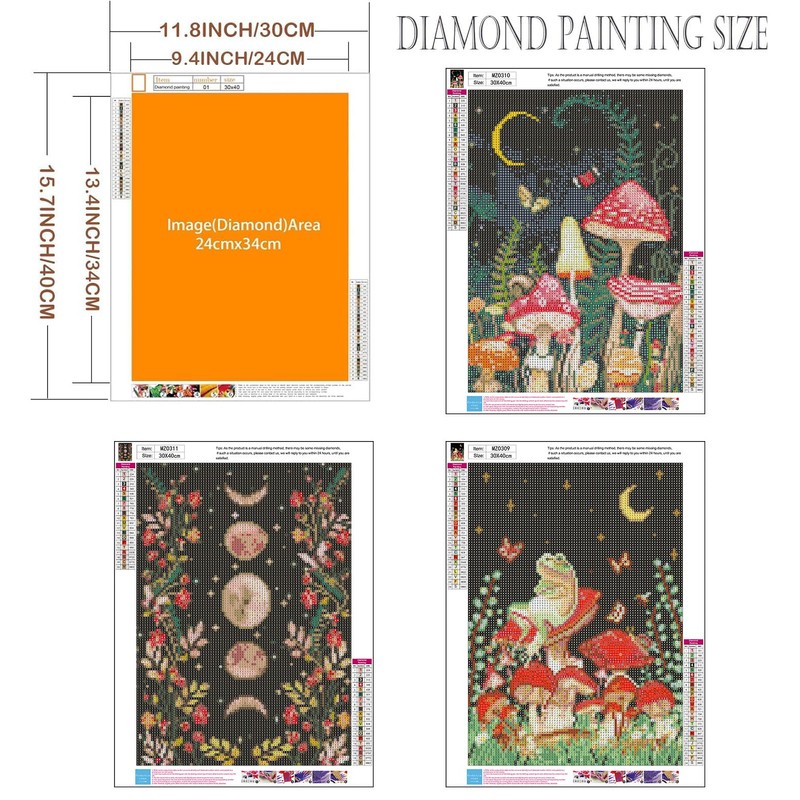 - WHAT YOU WILL GET: Axquilon mushroom diamond art kits for adults Includes 1 * HD Environmental Protection Canvas, 1*point diamond pen, 1* diamond tray, 1*red glue clay, 10* ziploc bags to store the diamonds, and enough colorful round diamonds, we'll provide 30% diamond more than need.