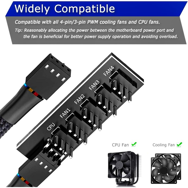 The cable is 4-Pin female to 4-Pin male and supports both 4-Pin and 3-Pin fan cables, and the 1-to-5 split 5-way fan power extension cable is compatible with both 4-Pin and 3-Pin PC chassis motherboard fans.
