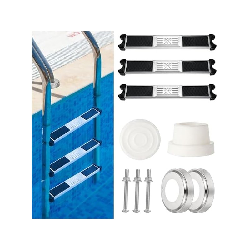 3 Pack Stainless Steel Swimming Pool Ladder Steps with Pool Ladder Bumpers & Pool Ladder Escutcheon Plates, 18'' Heavy Duty Replacement Pool Ladders for Inground Swimming Pools