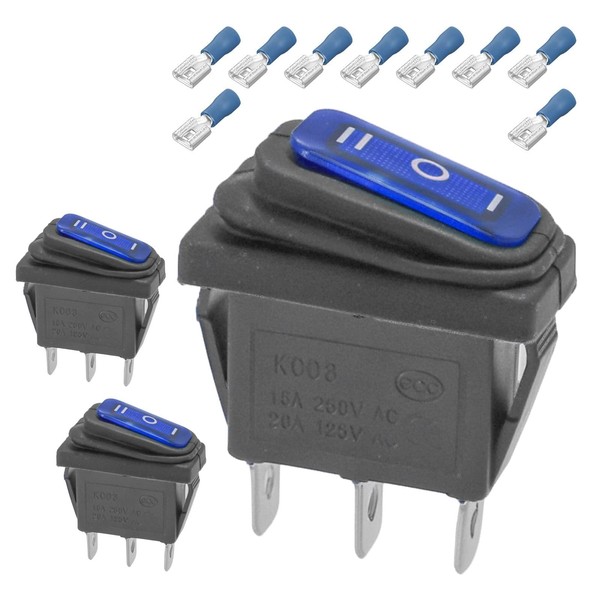 3-Pack Waterproof Rocker Toggle Switch with Blue Light, ON/Off/ON SPDT 3Pin Illuminated Lighted Boat Switches for Home Auto Car Marine Boat, KCD3-103