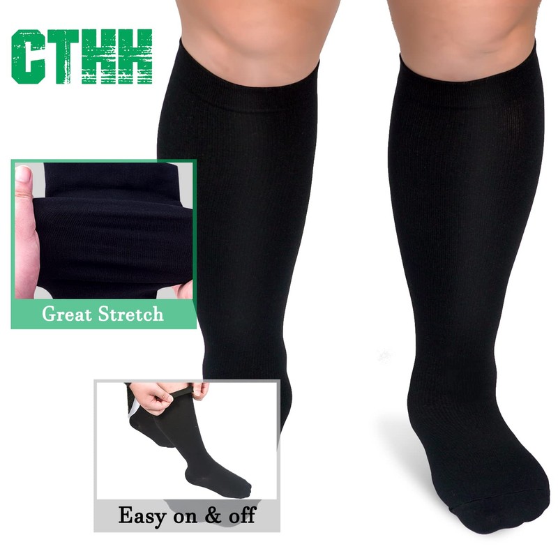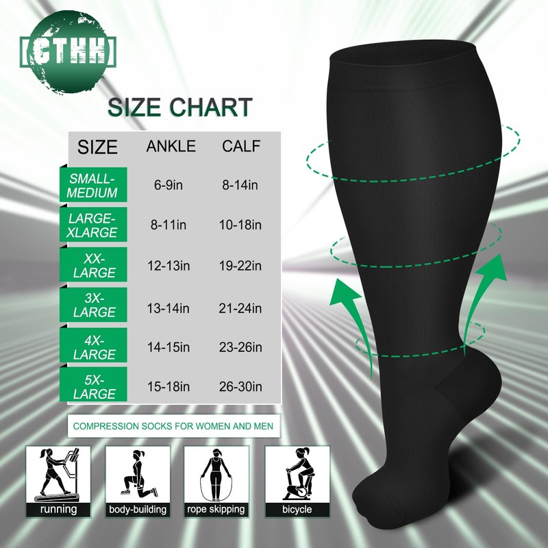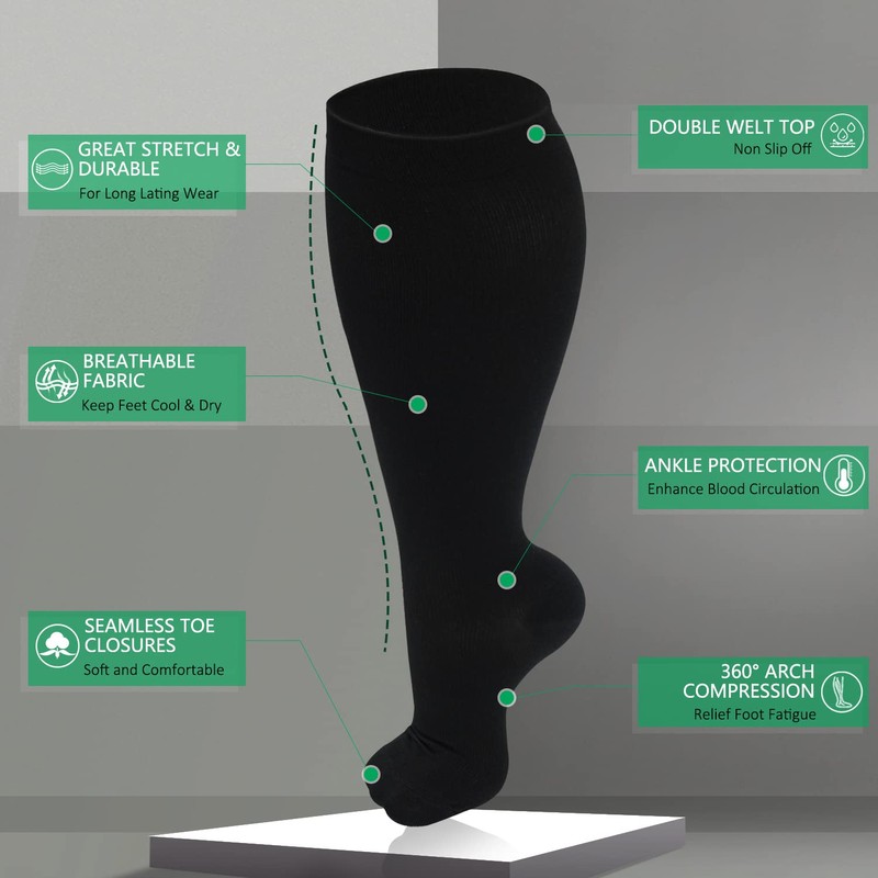 - 【WIDE CALF DESIGN】- NEW FIT Extra Wide Calf Compression Socks, specially designed for women and men who wear in exlarge or plus size, bring your legs strong support and long lasting comfort. We provide more size choices (XL-5XL) for ankle up to 16 inches, calf 17 to 28 inches’ circumference, you can refer to the size chart to choose the suitable size.