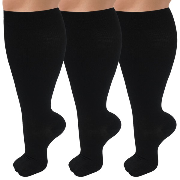 3 Pack Wide Calf Compression Socks for Women & Men, 20-30 mmhg Plus Size Knee High Stockings for Circulation Support, Black 2XL