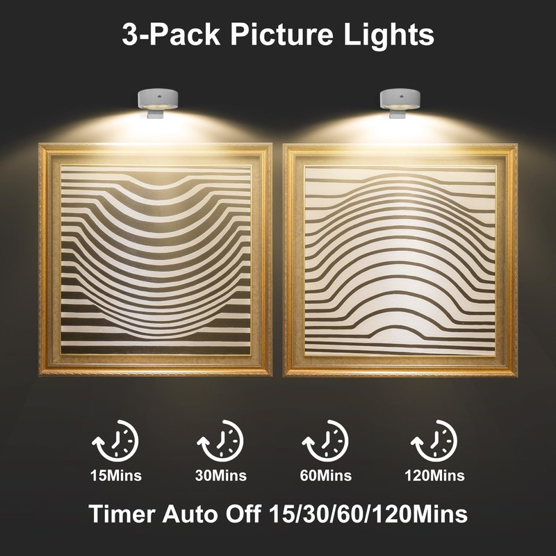 - [Auto OFF Timer Art Lights for Paintings]The easy-to-use timer function that allows you to set the picture light to automatically turn off after 15, 30, 60 or 120 minutes.