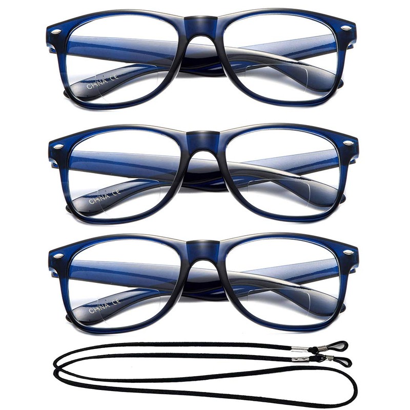 3 Packs Blue Bifocal Reading Glasses Big Frame Reading Glasses Bifocal Reading Glasses Simple Classis Stylish-with 1 Lanyard