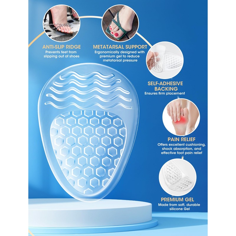 - [Powerful Cushioning] Made with premium soft gel, these metatarsal foot pads for women provide effective pressure relief and shock absorption. Ideal for extended standing or walking, they help reduce ball of foot pain, making them the perfect foot cloud gel cushion