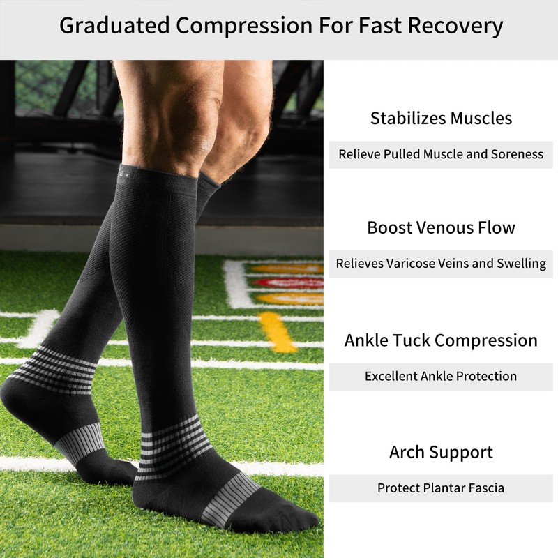 - 【Prevention & Improvement】Prevents calf cramps and muscle soreness from high intensity exercise. Prevent swelling due to prolonged standing or sitting. Prevents the top of socks from slipping off. Compression is proven to allow you to move faster, react more quickly,expend less energy, reduce fatigue and speed muscle recovery.