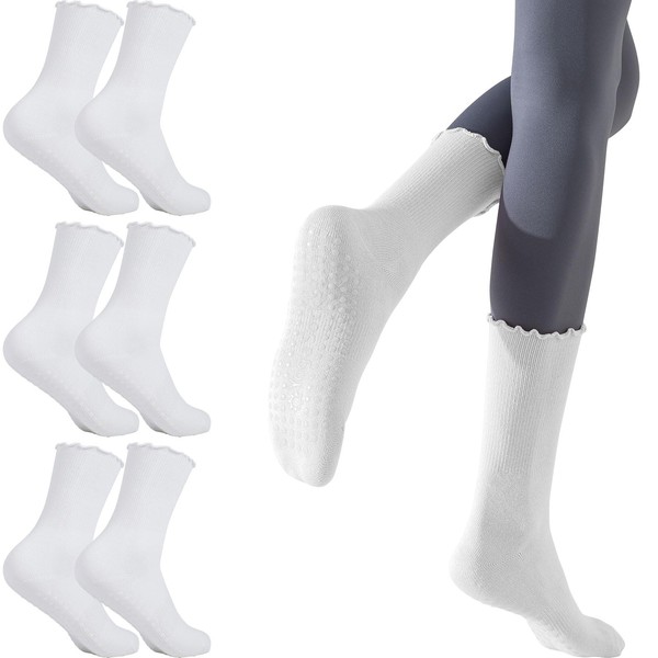 3 Pairs Pilates Socks with Grips Non Slip Ruffle Yoga Socks Grip Socks for Ballet Dance Barefoot Workout Pregnant Crew Socks (UK, Alpha, One Size, Regular, Regular, 3 Pairs - White)