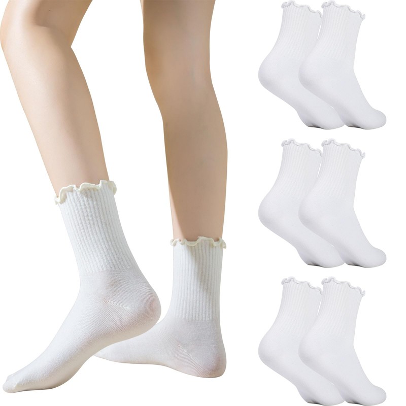 3 Pairs Ruffle Socks Women Casual Cute Ankle Socks Breathable Knit Cotton Soft Frilly Crew Socks for Women (CA/US, Alpha, One Size, Regular, Regular, 3 Pairs - White)
