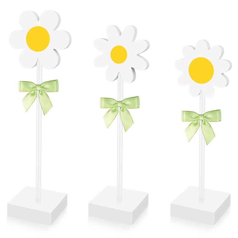 3 Pcs Daisy Wooden Sign Decor Tall Standing Daisy Block Set with Cute Bow Charming Flower Wooden Table Sign Daisy Table Centerpiece for Rustic Home Farmhouse Party Tabletop Decoration