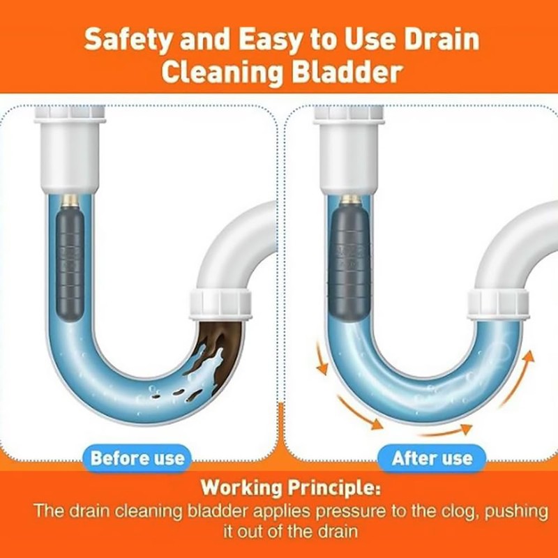 - 3 different sizes of drain rubber bladders for drains 1-2 inches, 1.5-3 inches and 4-6 inches in diameter, effectively tackling clogs in kitchen sinks, bathtubs, showers, main drains, and outdoor sewers