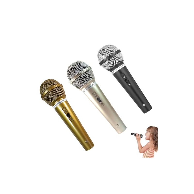 - 【Versatile 3-Piece Set】Includes 3 colorful fake microphone props (17cm/6.7" tall) in gold, black and champagne finishes, These durable plastic toy microphones for kids are perfect for pretend play, karaoke parties, or stage performances.