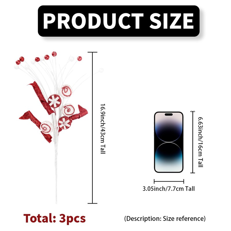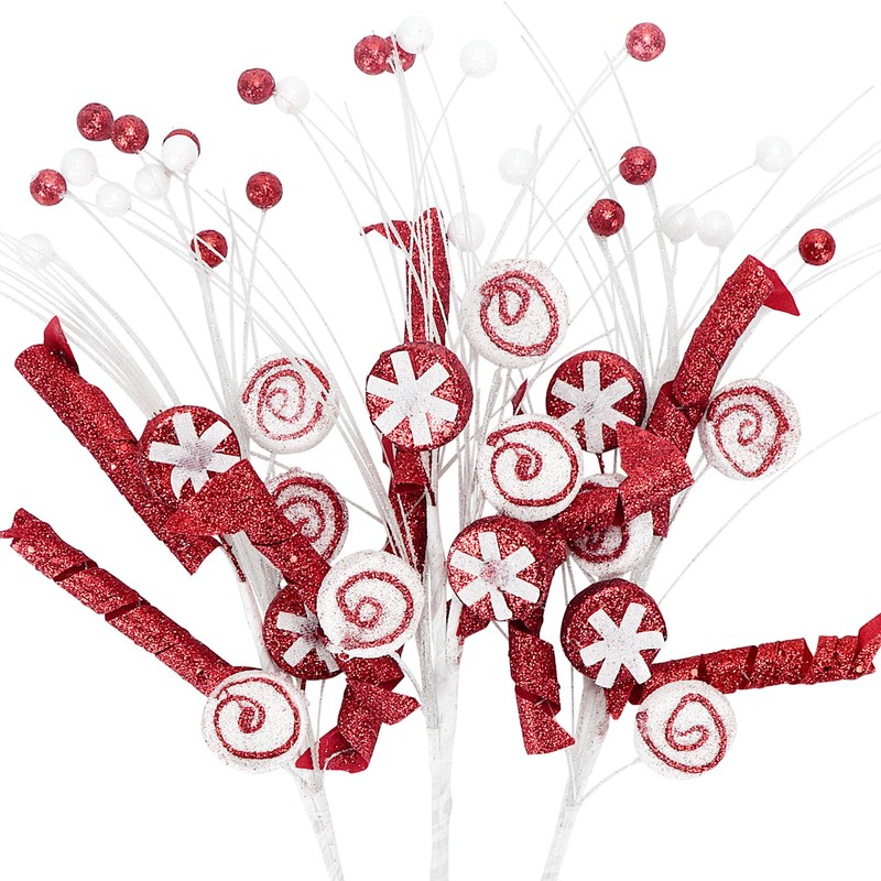 - This glittery red whimsical pick puts four main elements - the frizzy curly sprays, foam candy cane ornament, berry ball stems, and ting branches.