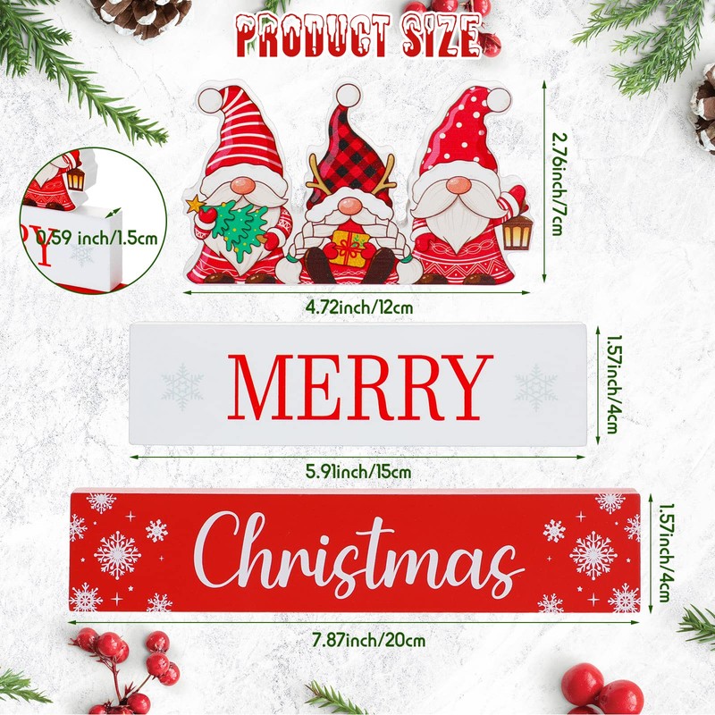 - Size Information: the Christmas table decorations come in 3 sizes, the gnome is approx. 12 x 7 x 1.5 cm/ 4.72 x 2.76 x 0.59 inches, the Merry is approx. 15 x 4 x 1.5 cm/ 5.91 x 1.57 x 0.59 inches, and the Christmas is about 20 x 4 x 1.5 cm/ 7.87 x 1.57 x 0.59 inches, appropriate dimension to fit various areas in your home