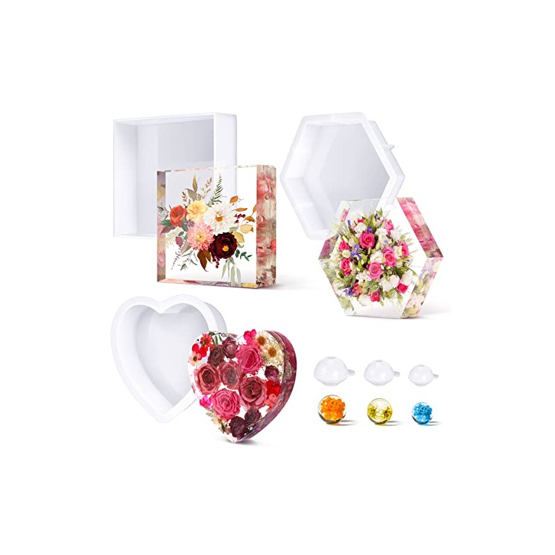 3 Pcs Large Silicone Molds for Resin Glossy Deep Square Molds Hexagon Silicone Molds Heart Bookends Resin Mold with 3 Pcs Round Epoxy Resin Molds for Flowers Preservation DIY Art Making Home Decor