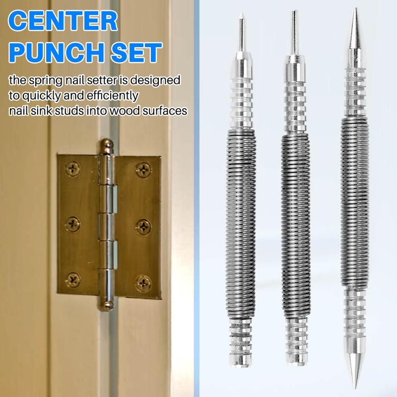 - Different : the spring nail setter is designed to quickly and efficiently nail sink studs into wood surfaces, and the hinge pin tool allows you to easily adjust and remove the hinge pin without accidental movement and breaking trim; Our center punches can be quickly punched to mark in specific locations, most working in areas that traditional hammers might not be to reach