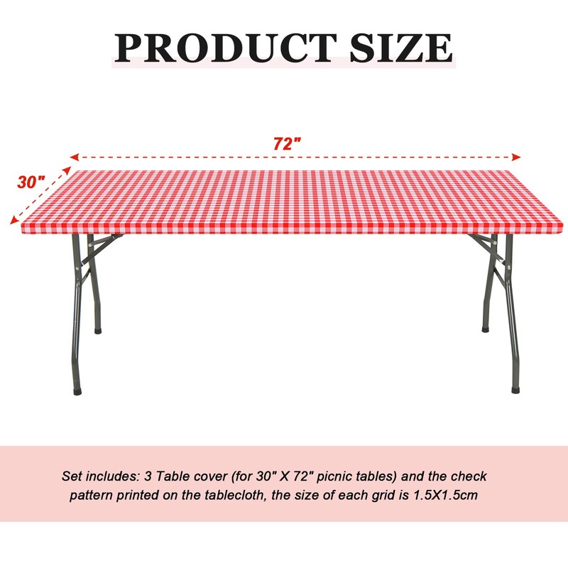3 Pcs Plastic Picnic Table Cover Checkered Tablecloth Fitted Rectangular Table Cloth 30 x 72 Inch Vinyl Waterproof Flannel Backed with Elastic Rim for Indoor Outdoor Picnic Party