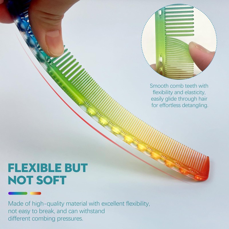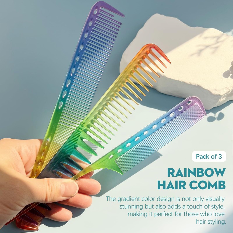 The 3-piece rainbow comb set offers versatile hairdressing tools for styling, teasing, and parting. With anti-static and heat-resistant properties, these combs prevent frizz and static, providing a comfortable experience. Durable and flexible, they are perfect for professional and home use, working well on straight, curly, and textured hair.