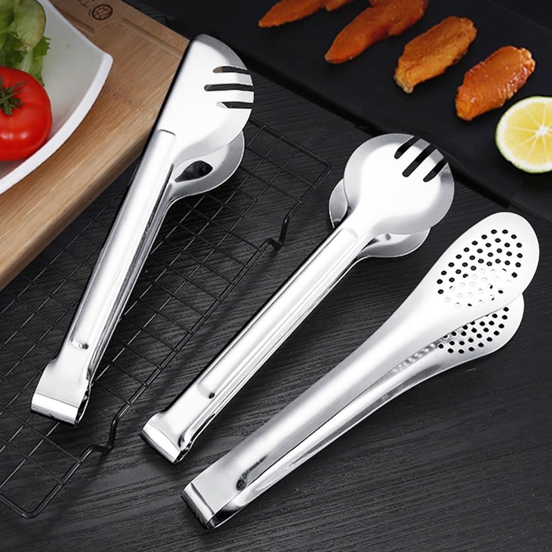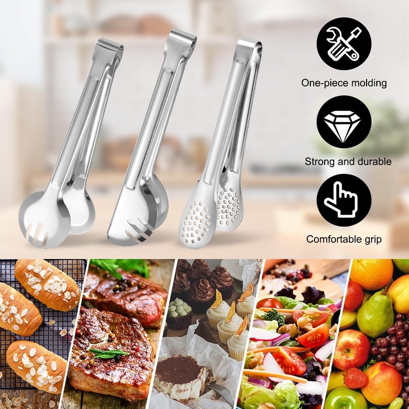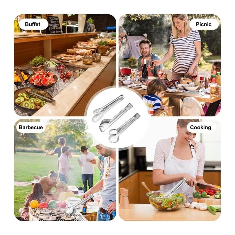 - Set of 3 Kitchen Cooking Tongs: The set includes 1 piece of half-round cooking tongs, 1 piece of full-round frying tongs and 1 piece of multi-hole cooking tongs stainless steel. Easy to carry, suitable for indoor and outdoor use. Sufficient quantity to meet the needs of various family use scenarios, share with your loved ones and enjoy delicious food together.