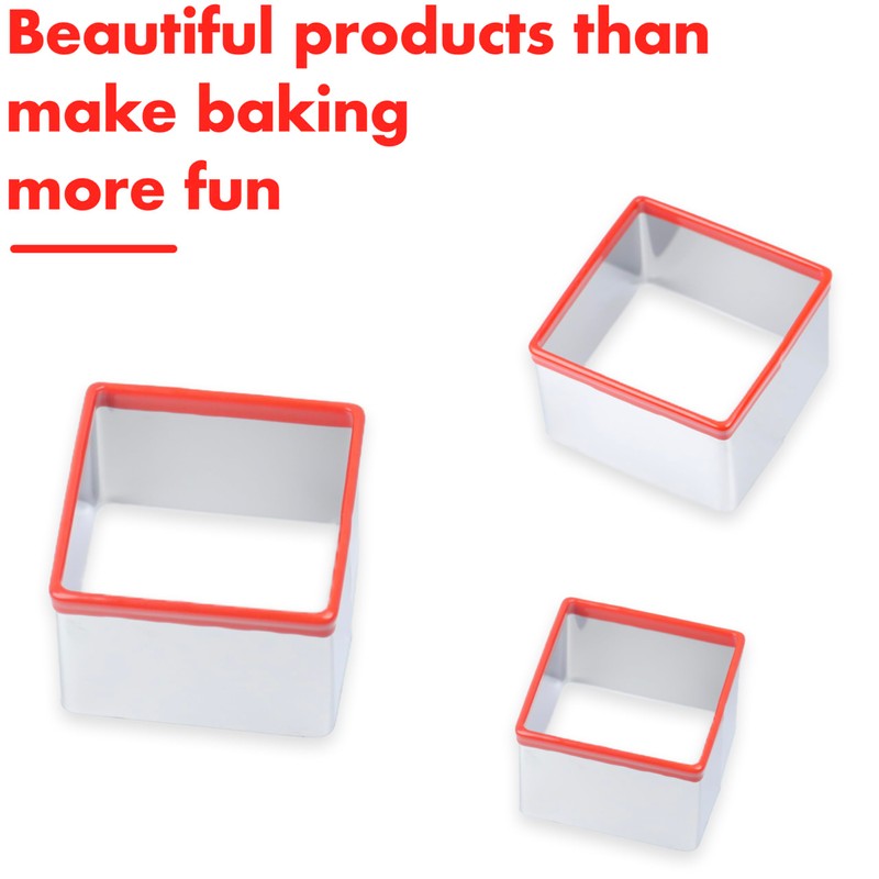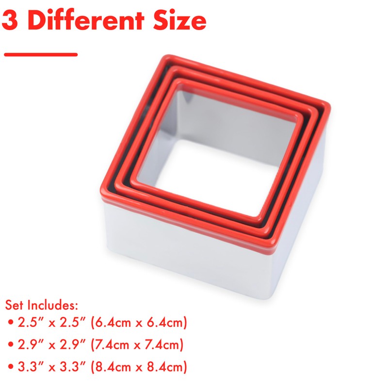 - SET INCLUDES: Complete set of 3 square cookie cutters in graduated sizes - 2.5 inch, 2.9 inch, and 3.3 inch for versatile baking options