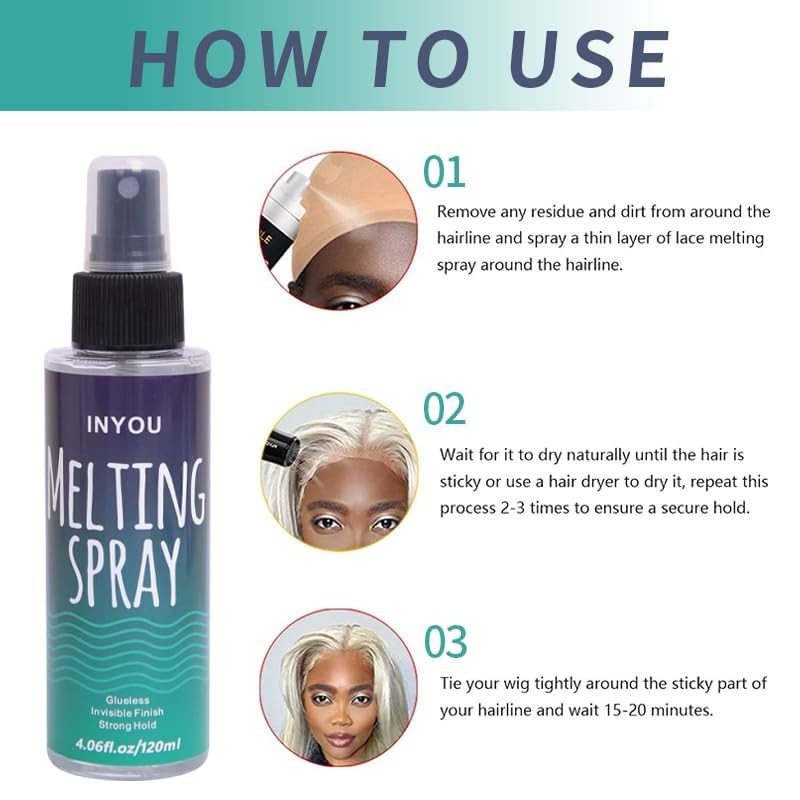 - 【Effortless Lace Melting:】Our lace melting spray for wig gives you long-lasting results, ensuring a flawless hairline. Use it after your glue installation for optimal results and enjoy a mess-free application that eliminates the sticky residue often found with traditional wig glues. Experience a hassle-free wig installation every time!