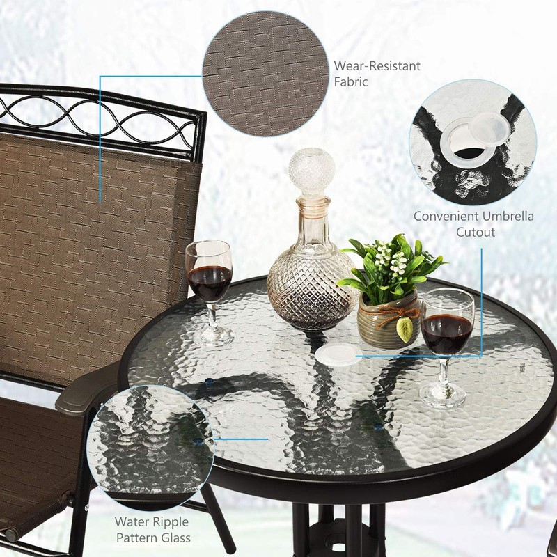 3-Piece Bistro Set, Patio Dining Furniture Set, Round Textured Glass Tabletop w/Umbrella Hole, Outdoor Conversation Set for Backyard Garden Poolside
