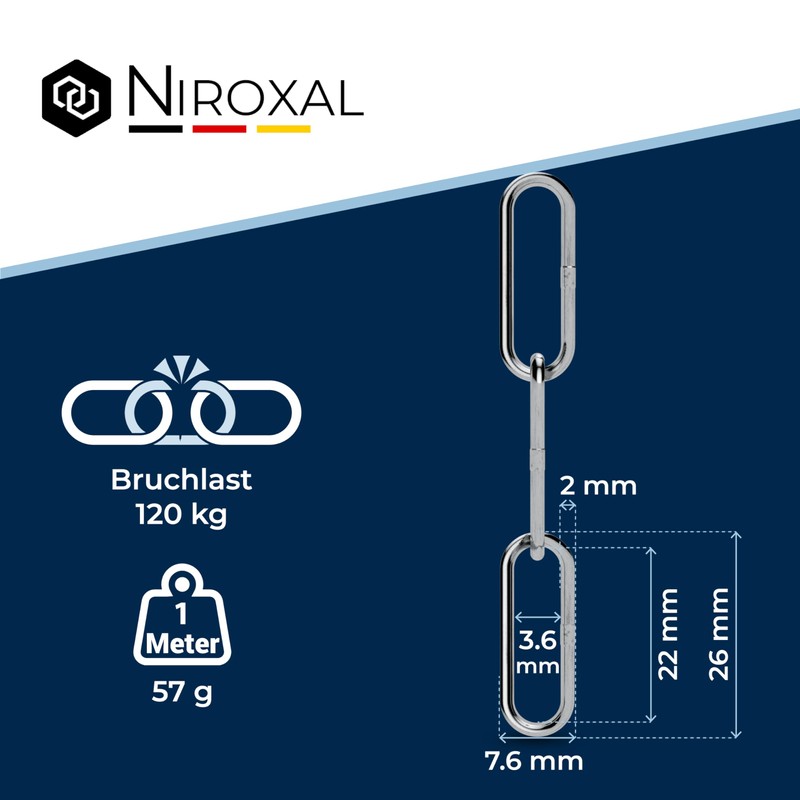 - Wire thickness: 2 mm, chain link length outside: 26 mm, chain link length inside: 22 mm, chain link width outside: 7.6 mm, chain link width inside: 3.6 mm, breaking load: 120 kg, weight per metre chain: 57 g