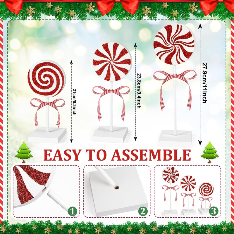 - Detailed dimensions: These candy sets stand at 7.5/9/10.6 inches, the candy measures 8.5 cm/3.3 inches, the square base is 6 cm/2.4 inches, and the candy is 0.5 inches thick. Enough to meet your Christmas decoration needs.