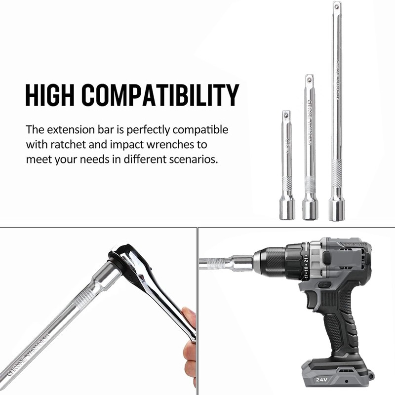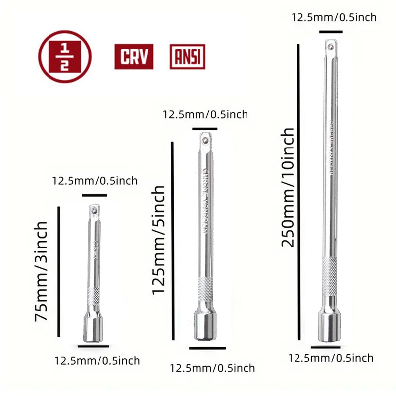 3 Pieces Extension Bar Set 1/2 Inch Drive Socket Extension Chrome Vanadium Steel, 1/2" Drive Straight Socket Ratchet Extension Bar Set 75mm 125mm 250mm