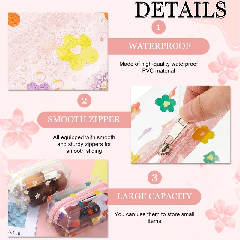 - CONVENIENT PACKAGING You will get 3 clear travel bags in different flower styles. You can use them to store small items such as lipstick, makeup brushes, keys, mobile phones, cards, etc. that meet your requirements for different purposes.