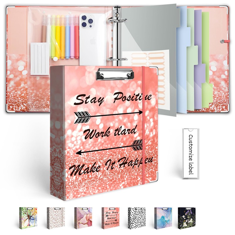 3 Ring Binder 2 Inch, Three Ring Binder Organizer with Clipboard, 5-Tabs Pockets Dividers, Plastic Folder, 18 Divider Stikers, BVSSX Pink Decorative Binder with Pen Loop (Stay Positive, Letter Size)