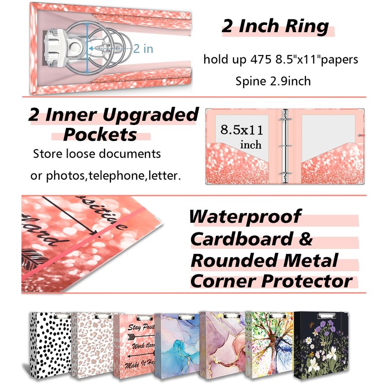 - 【High quality 2 Inch Binder】This firm 3 ring 2 inch binder with flat lay design, and the clipboard on the front can hold up 100 sheet paper, the cardboard cover with durability is tear-resistant. The binder ring is strong and won't misalign, push button make it easy to open. Elastic closure straps to hold the binder shut. Rounded metal corner protection to prevent contents from damaging