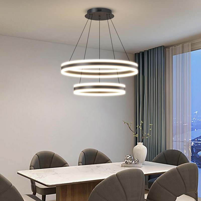 - Adjustable Height for Personalized Style: This modern chandelier features a 3-layer circular design, offering a minimalist aesthetic with customizable style. The 3 rings have diameters of 7.87inch, 15.7inch, and 23.6inch, with a ceiling canopy diameter of 11.8inch. The adjustable metal cables allow a maximum height of 59.1inch. With a DIY design, you can easily adjust the cables of each light ring to create various shapes and appearances, making it the perfect light fixture for dining rooms, kitchen islands, or living rooms.
