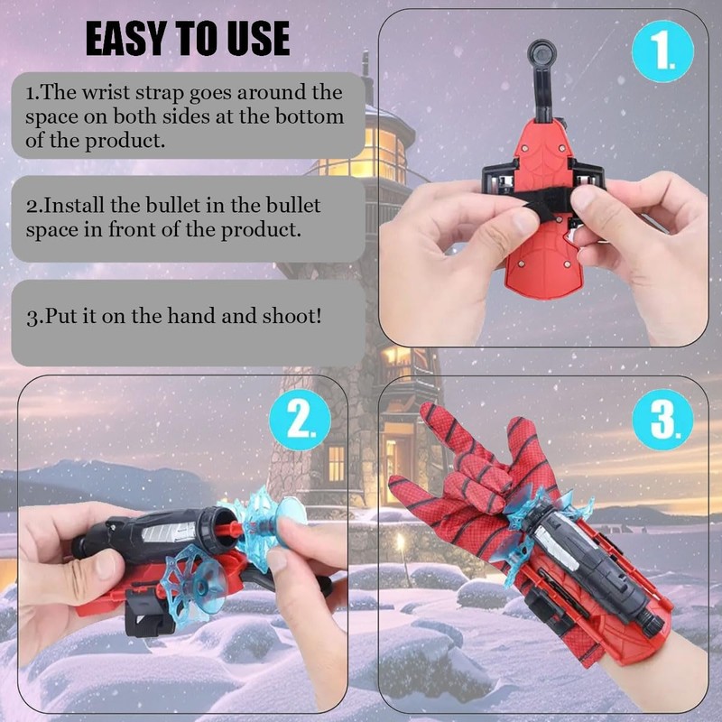 - Packing list:Include Pack Product List: 3* Glove, 3* Launcher, 10* Bullets Darts, 3 * Sucker Darts, 4* Disk Bullets. Flexible wrist strap adjustment, Feel like a hero when your child wears this spider glove launcher.