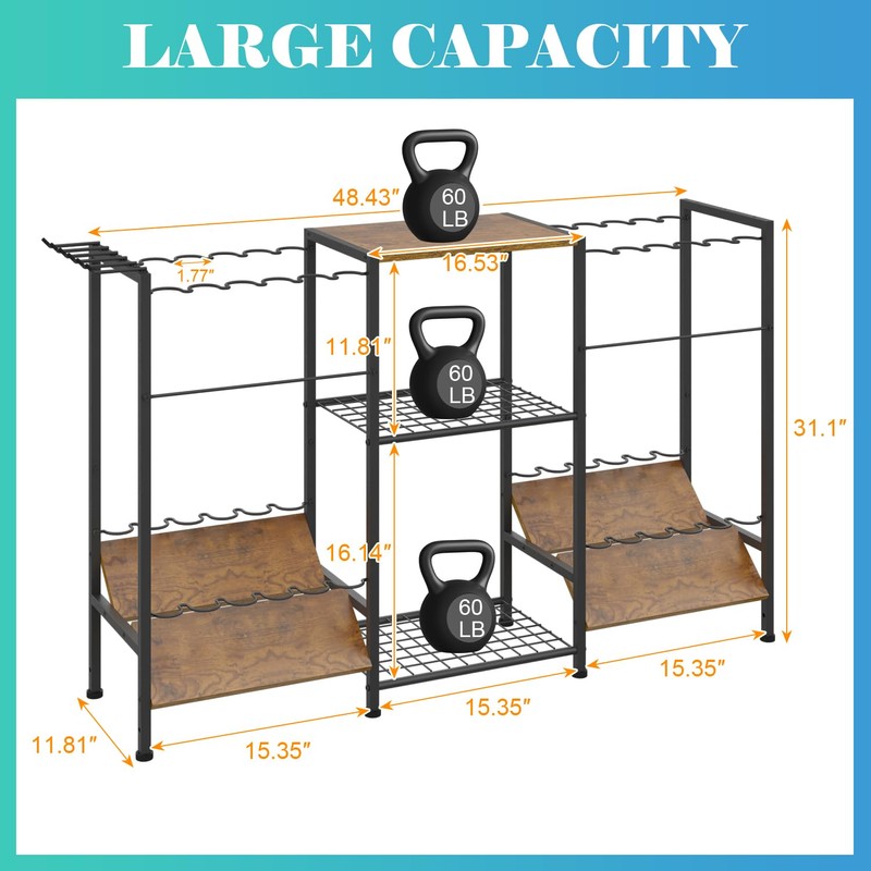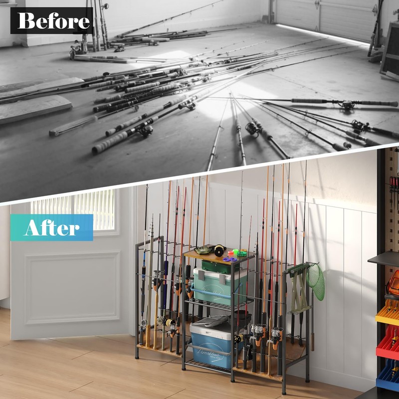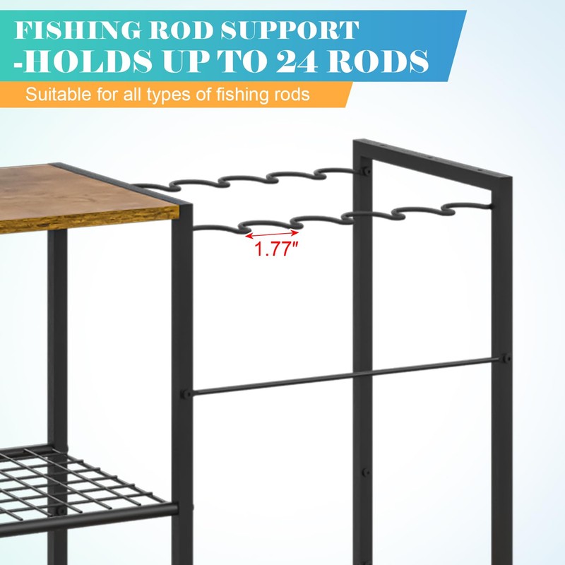 - ✅ Three-Sided Design with Efficient Fishing Rod Storage: Store 12 rods on each side using sturdy metal rings designed for a variety of fishing rod holders and fishing pole stands. The center section features two metal mesh shelves and a durable wood top shelf for fishing tackle storage and other gear, making it more than just a traditional fishing rod stand for garage or shed.
